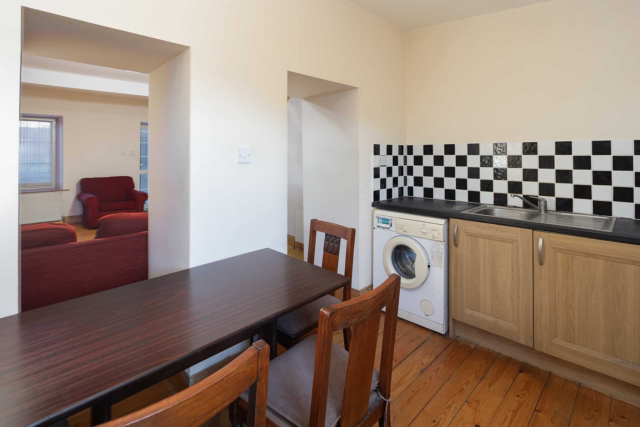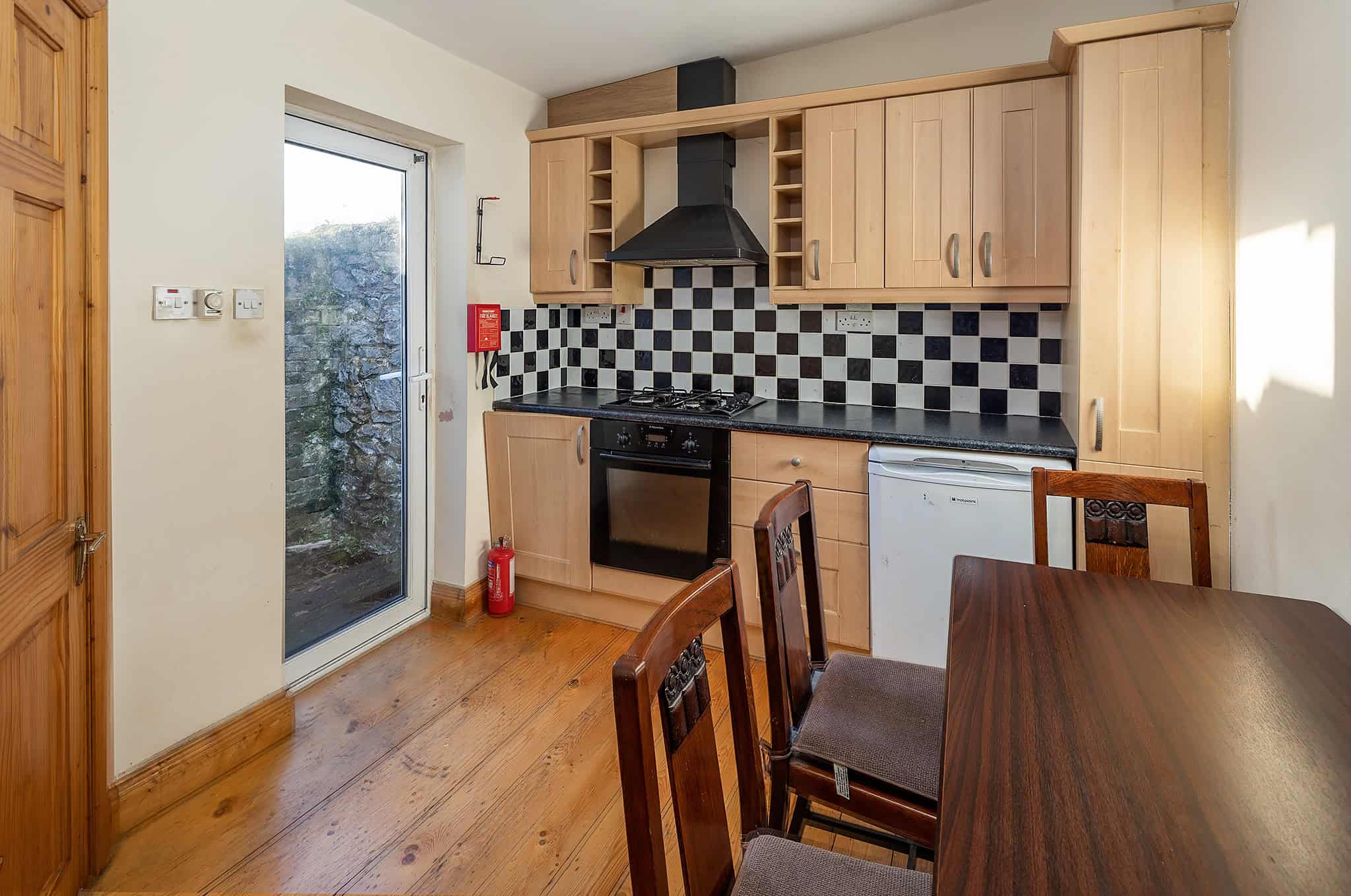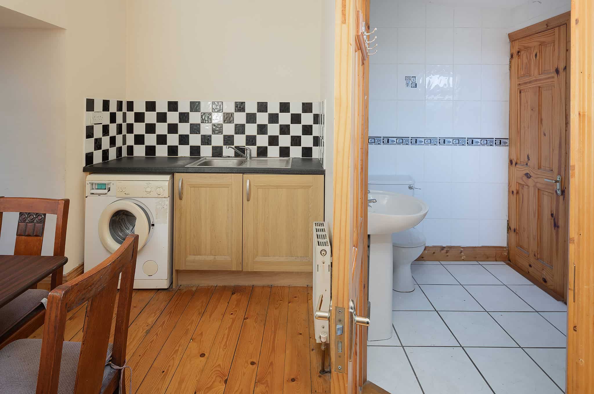 Kitchen including electric hob & oven, fridge & washing machine. Tiled flooring. Door to rear yard.