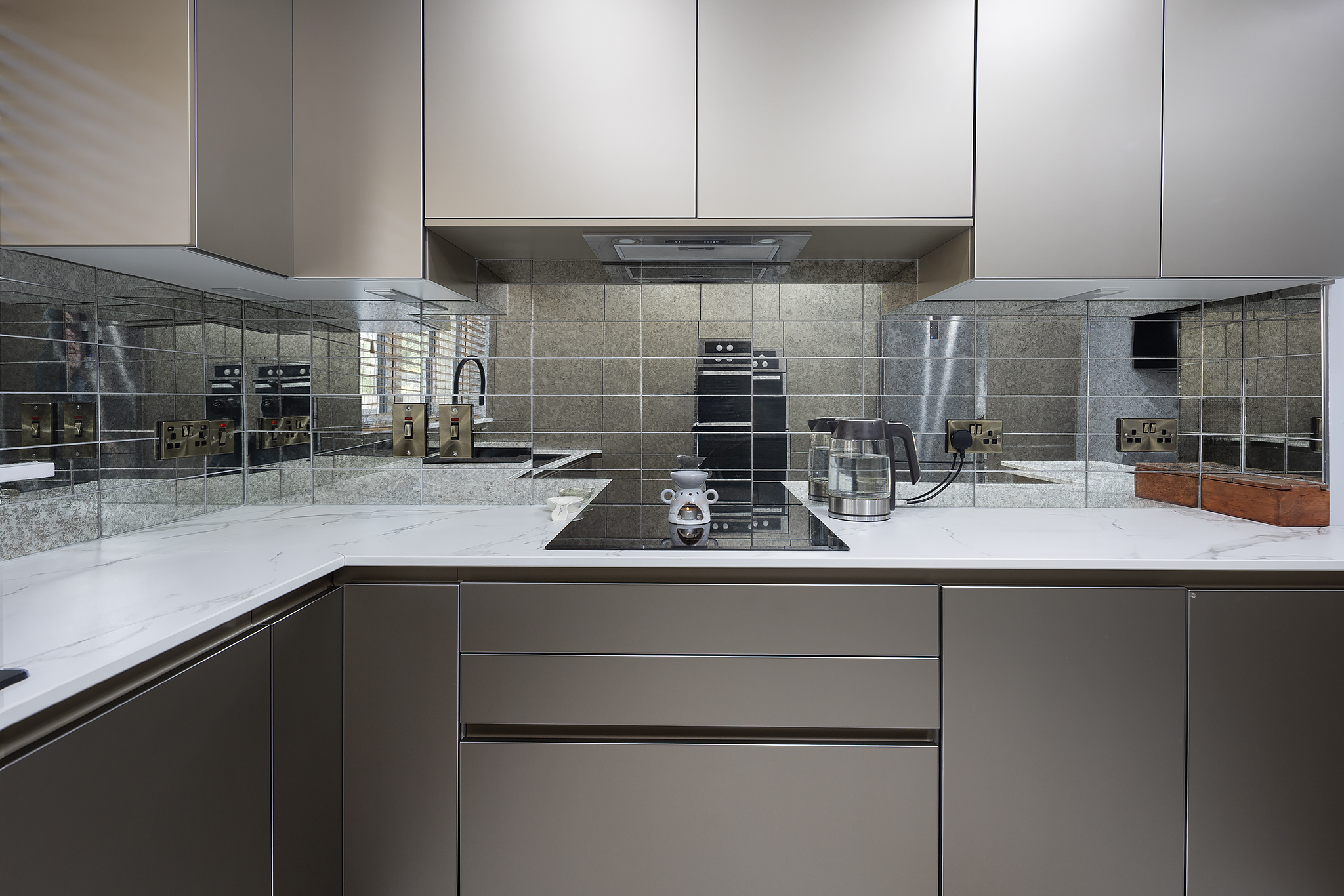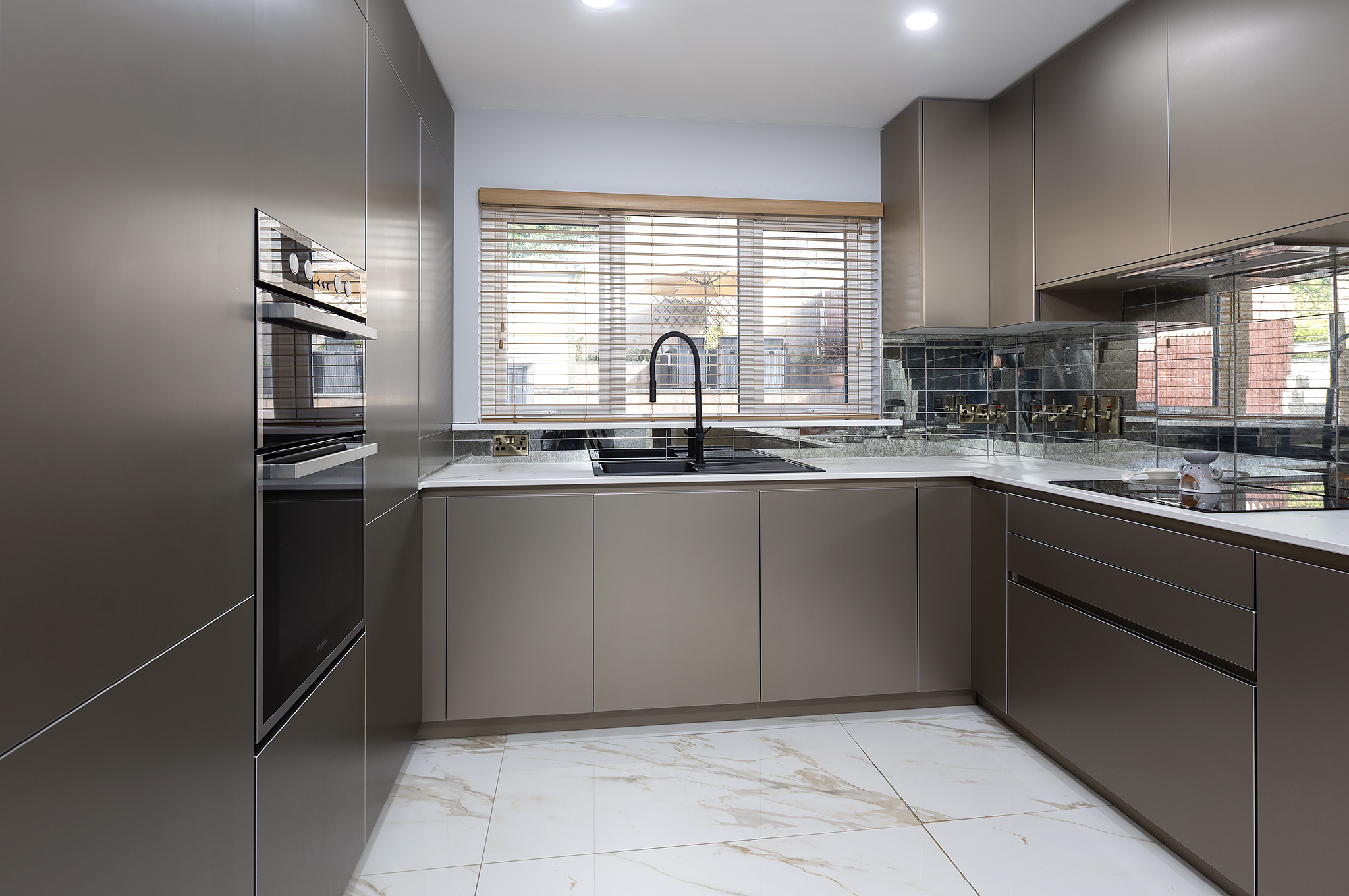 Upon entering, the property opens into a bright and welcoming entrance hall finished with solid cherry wood flooring and elegant double doors leading through to the main living space. The living room is a spacious and inviting area, enhanced by a bay window that floods the room with natural light, a featured open fireplace, and high-quality solid cherry wood flooring. This room flows seamlessly into the dining area, continuing the same rich flooring and offering double French doors that open out to the rear garden, creating an ideal space for both everyday living and entertaining. The kitchen is fitted with a bespoke Chris Keating design, complete with glass mirrored tiling, recessed lighting, tiled flooring, and a practical breakfast counter, while a separate utility room – plumbed for a washing machine and with convenient side access – adds further functionality. A generously sized guest WC with a modern white suite completes the ground floor.