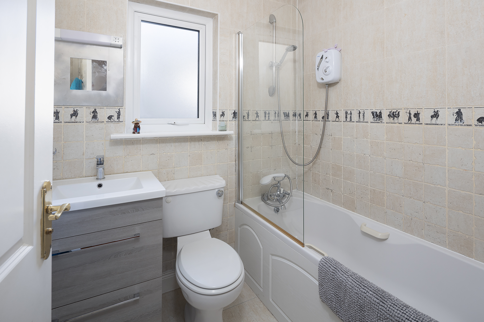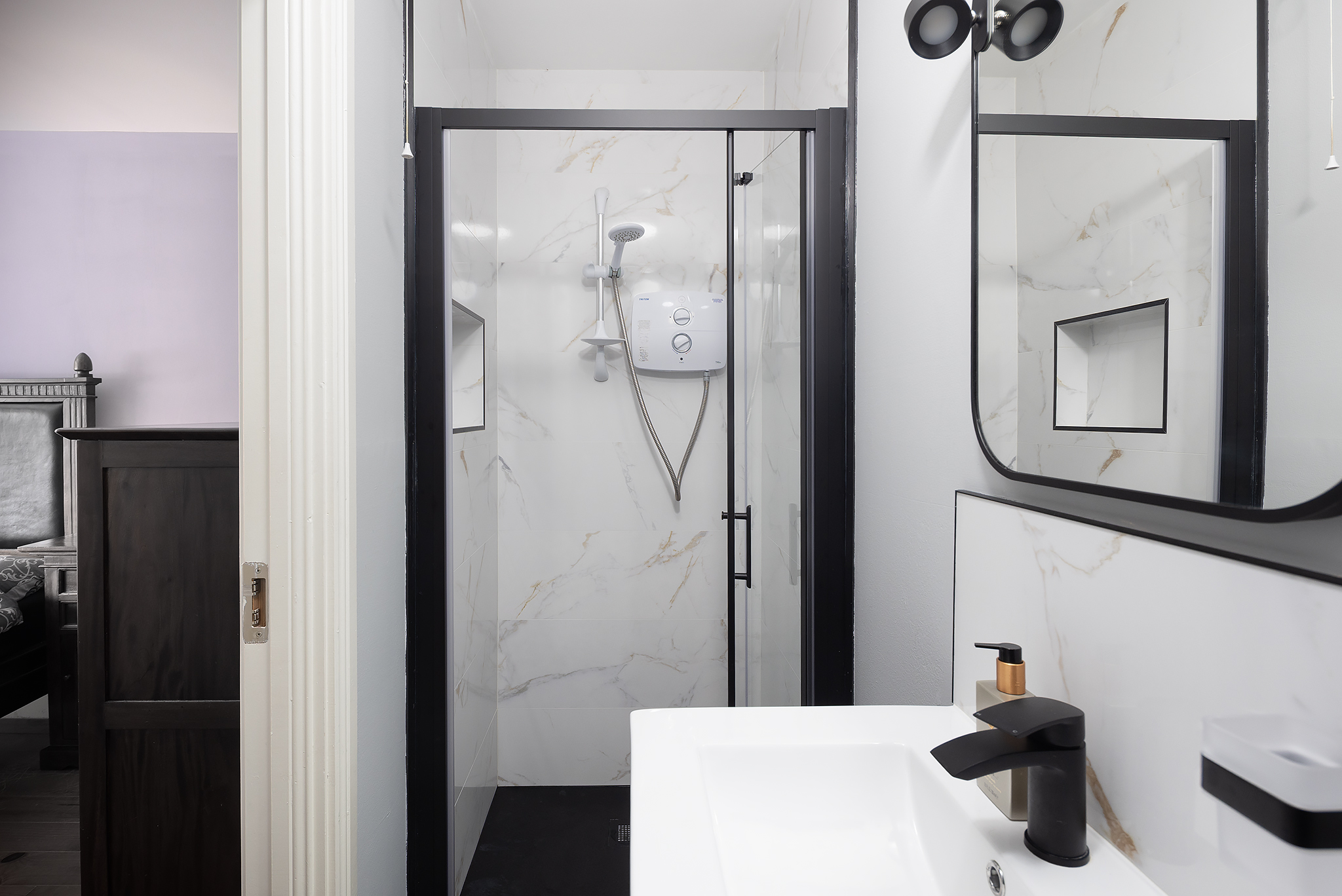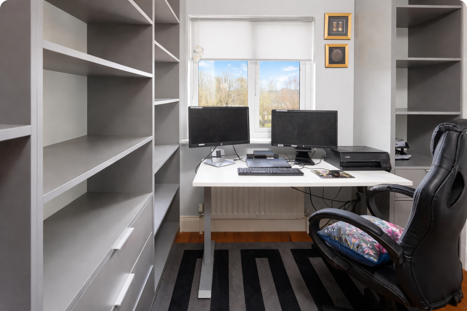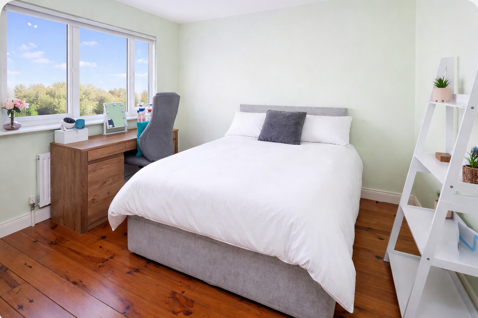 Upstairs, the accommodation is equally well-appointed, featuring solid Canadian pine timber flooring throughout and a teak staircase adding warmth and character. The main bedroom is a bright and spacious retreat with a bay window, fitted sliderobes, and a high-end en suite with an electric shower. A second double bedroom to the rear includes fitted wardrobes, while a further generously sized single bedroom overlooks the garden. The fourth bedroom, currently fitted as a study, offers built-in shelving and wardrobes, making it ideal for home working. A fully tiled family bathroom with power shower completes the upper level.