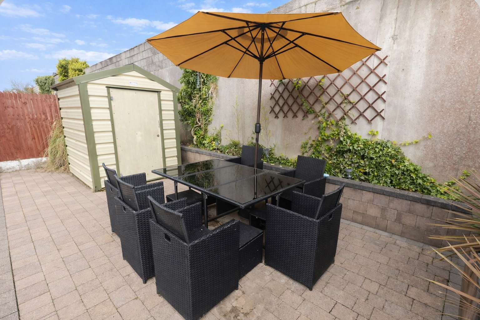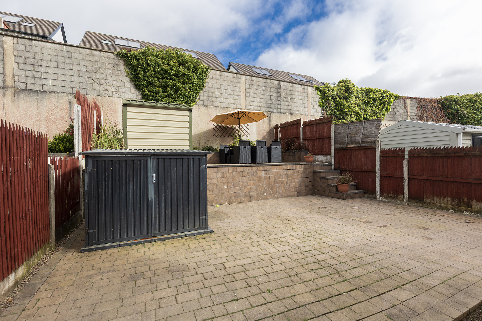 To the rear, a cobblelock-paved, tiered garden offers three distinct patio areas—perfect for outdoor dining and entertaining—along with a Steeltech shed for additional storage.
