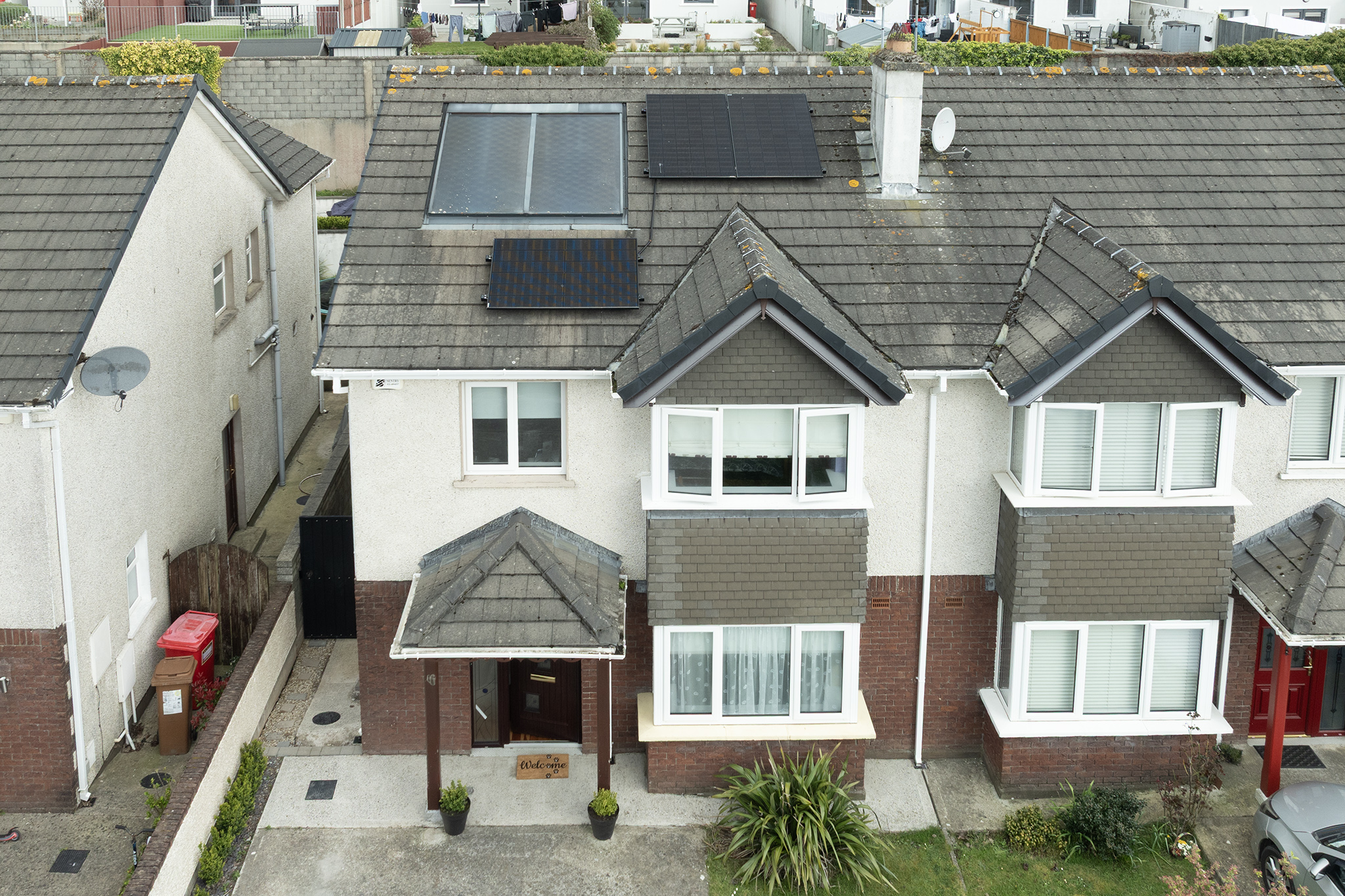 Positioned in a quiet cul-de-sac, the property benefits from a large private driveway with space for two cars, along with additional visitor parking bays nearby. The front garden is enhanced by mature planting and an attractive covered porchway, creating a welcoming first impression.